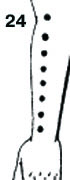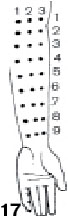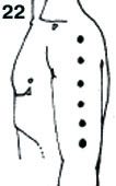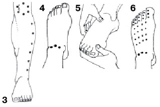 Действие 22. Тыльная поверхность стопы. В этой области, в быту называемой подъемом ноги, точки расположены четырьмя параллельными рядами, начинающимися из межпальцевых промежутков и продолжающимися по легко прощупываемой межкостной борозде. В каждом ряду – 4 точки (рис. 6). Держа пальцы ноги в одной руке, массажист надавливает на точки большим пальцем другой руки, начиная с первой точки, расположенной между большим и вторым пальцем. Давление на каждую точку длится 3 сек. Таким образом обрабатываются все 16 точек.