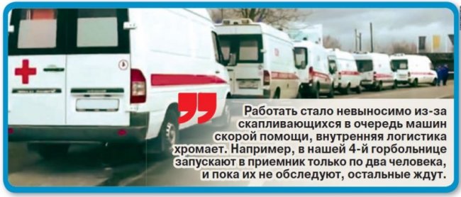 Мои коллеги жалуются, что работать стало невыносимо из-за скапливающихся в очередь машин скорой помощи, внутренняя логистика хромает. Например, в нашей 4-й горбольнице запускают в приемник только по два человека, и пока их не обследуют, остальные ждут. Могли бы организовать иначе, зачем столько вредности уже на этом этапе? Если все организовать правильно, можно было бы принять 40 и даже 60 пациентов, ведь поступление можно спрогнозировать.