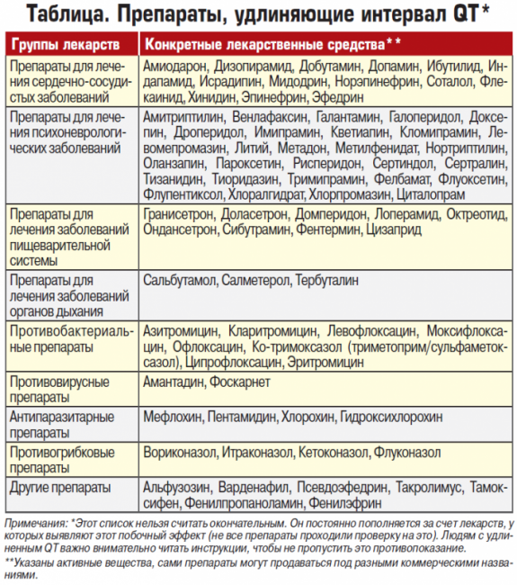 И конечно, важнейшую роль в этом играет отказ от приема некоторых лекарств, удлиняющих интервал QT (см. табл.). Людям с этим синдромом рекомендуется отказаться от них и тем более не принимать два и более таких лекарств одновременно.