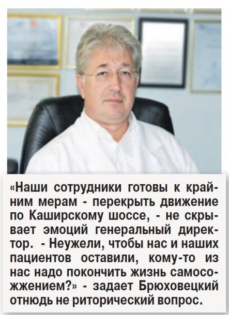 - К противостоянию и административному давлению со стороны нового руководства Онкоцентра за последние два с половиной года мы привыкли, но сейчас речь идет о жизнях людей, которые им сохраняет наша клиника, а будет ли она существовать завтра - большой вопрос. И наши сотрудники готовы к крайним мерам - перекрыть движение по Каширскому шоссе, - не скрывает эмоций генеральный директор. Видно, что нервы у человека на пределе. - Неужели чтобы нас и наших пациентов оставили, кому-то из нас надо покончить жизнь самосожжением? - задает Брюховецкий отнюдь не риторический вопрос.