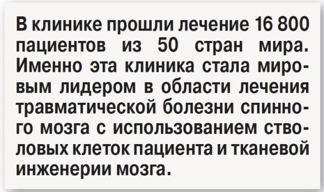 Именно эта клиника стала мировым лидером в области лечения травматической болезни спинного мозга с использованием стволовых клеток пациента и тканевой инженерии мозга. Ведущими направлениями деятельности клиники остаются неврология, нейрохирургия, онкология, нейроонкология, онкоиммунология, регенеративная медицина. Помните ли вы это, Иван Сократович?