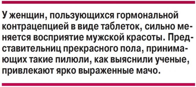 Как ученые определяли женские вкусы? Они показывали женщинам изображения мужчин разных типов. И те дамы, которые регулярно принимали гормональные контрацептивные таблетки, больше предпочитали внешне мужественных мужчин. И наоборот, не пользовавшиеся такими противозачаточными преимущественно имели прямо противоположные вкусы.