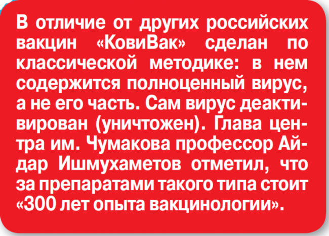 Такая технология изготовления вакцин применялась в Советском Союзе, ей уже более 70 лет, поэтому «КовиВак» вызывает особое доверие у людей старшего возраста. По этому принципу сделаны, например, вакцины против полиомиелита центра Чумакова, а также тифа, холеры, чумы и гриппа от других производителей.