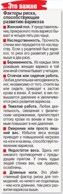 Представьте другой вариант: движению крови к сердцу что-то препятствует. Так бывает у людей с излишним весом или у женщин во время беременности. Поэтому для защиты от варикоза старайтесь сбросить лишние килограммы, больше двигайтесь. Если приходится долго сидеть или стоять, старайтесь чаще двигать ногами или хотя бы просто иногда работайте мышцами. Избегайте очень тяжелых работ. От беременности отказываться не надо, несмотря на то, что расширение вен возникает чуть ли не у половины женщин, вынашивающих ребенка. Это еще не болезнь, а просто временное состояние, которое проходит после родов. Истинная же варикозная болезнь возникает только у 10% беременных.