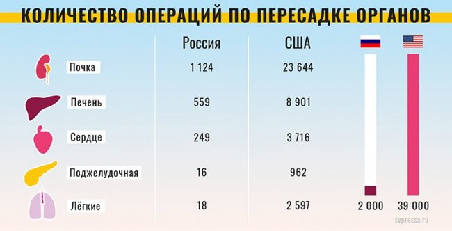 Понятно, что нужно пройти большой путь, чтобы пересадка органов в РФ была такой же распространенной операцией, как и в США. Так, в опубликованных материалах V Российского Национального Конгресса трансплантологов, который состоялся 27−29 сентября 2021 года, говорится: «Высокий уровень трансплантационной активности в столице компенсирует отсутствие и (или) низкую трансплантационную активность в большей части субъектов РФ…. При этом в масштабе всей страны (146,2 млн) значение данного показателя (количество трансплантаций на 1 млн населения) будет иным — 17,1 на 1 млн населения».