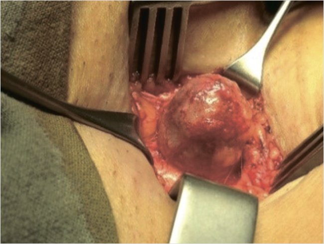 Оперирован 08.02.2019 г. в плановом порядке под субарахноидальной анестезией с внутривенной седацией. Близкое анатомическое расположение пахового канала и сафено-феморального соустья были основанием для выполнения одномоментно-последовательной операции из одного пахового доступа. Произведен операционный разрез на 1 см выше и параллельно паховой складки справа. В ходе оперативного вмешательства из этого доступа первым этапом из рубцовых тканей мобилизовано устье большой подкожной вены приустьевыми притоками (рис. 2).