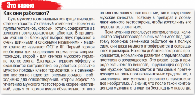 Скажем больше, уже сейчас есть несколько контрацептивов для сильного пола, сделанных на основе гормонов. По сути, эти лекарства уже испытаны и готовы к регистрации, но их введение на рынок пока откладывалось.