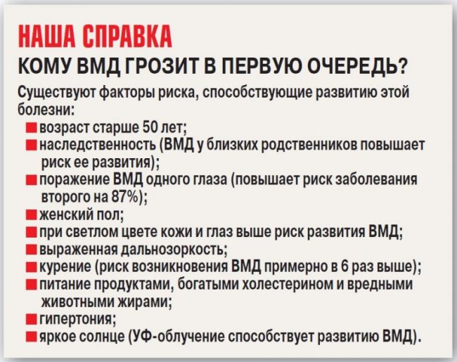 Возрастная макулярная дегенерация (ВМД) обычно развивается после 60 лет, но болезнь стремительно молодеет и ее все чаще обнаруживают у 40-летних. Многие пациенты даже не догадываются, что страдают этим заболеванием. Они воспринимают свои проблемы со зрением как обычные возрастные изменения, типичные для пожилого возраста. Это неправильно (см. «Наша справка»).