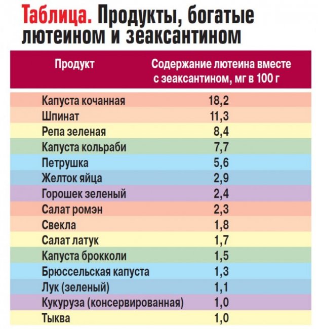 Эксперты рекомендуют потреблять ежедневно 4-6 мг этих пигментов, но среднестатистический человек съедает только 1-3 мг. Есть немало продуктов, содержащих приличные дозы лютеина и зеаксантина (см. таблицу). Вместе с ними вы будете получать много других полезных веществ, включая и бета-каротин, он очень близок им по составу и тоже является желтым пигментом. Но одного его недостаточно - развитию ВМД он не препятствует. Это было продемонстрировано в исследовании: бета-каротин, а также витамины А, Е и С возникновению и прогрессу ВМД не препятствовали. Но в целом они очень полезны в составе продуктов.