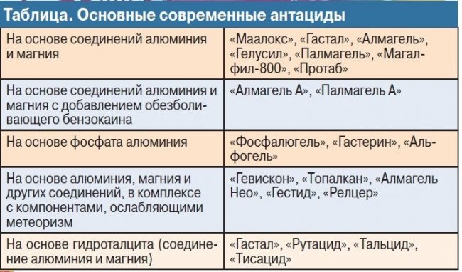 Паниковать из-за изжоги не стоит, но сделать соответствующие выводы следует. Во-первых, если беспокоит изжога, терпеть ее не нужно. Это же агрессия против пищевода, и чем дольше она продолжается, тем больше риск его повреждения. Во-вторых, примите антацид, так называют препараты, которые нейтрализуют кислоту. Они наверняка известны вам по рекламе: «Фосфалюгель», «Гастал», «Гевискон», «Алмагель», «Маалокс» и несть им числа (см. табл.). Антациды, по сути, являются безрецептурными средствами для лечения изжоги у здоровых, принимать их нужно эпизодически. Если причина изжоги болезнь, то лечение должно быть более серьезным, одних этих препаратов недостаточно и они будут играть не главную роль.