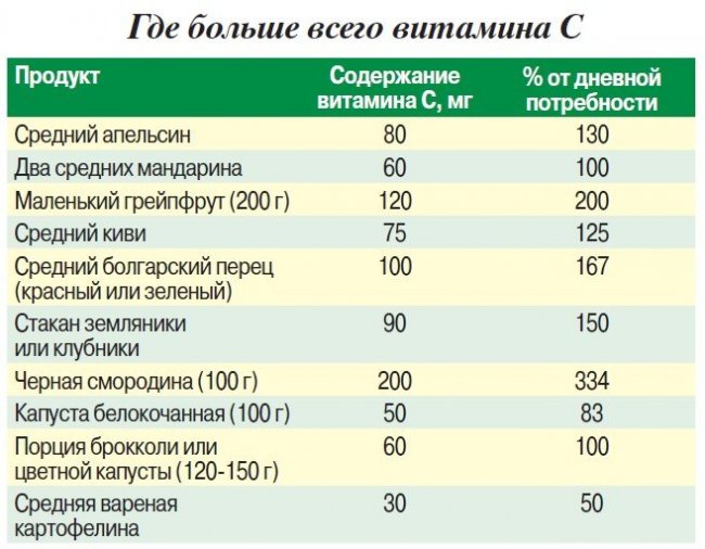Давайте посмотрим на кислый лимон трезвым взглядом. Витамина С, или аскорбиновой кислоты, в лимоне вопреки всеобщему заблуждению не так уж и много. Сравните: в небольшом апельсине содержится дневная норма этого витамина - 60 мг, а в таком же лимоне аскорбинки на треть меньше - всего 40 мг. Но и это не все. Если 1-2 апельсина мы съедаем запросто и с удовольствием, то целый лимон могут съесть лишь мазохисты. Обычная доза лимона - 1-2 дольки в чай. А в одной дольке лишь 3-5% от дневной потребности в аскорбиновой кислоте, и значительную часть этого витамина вы еще убьете горячим чаем. Так что в нашем питании лимон не столько кладезь витамина С, сколько хорошая вкусовая приправа. Но не расстраивайтесь, этот витамин - один из самых недефицитных. Есть куча даров природы, которые обеспечат вам его дневную норму с лихвой (см. таблицу).