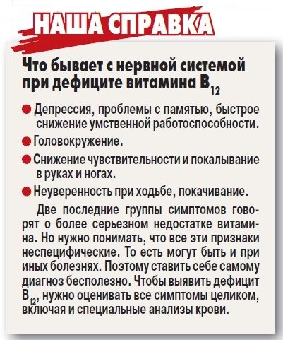 Недостаток этого витамина опасен не одной анемией. Как позже выяснилось, он очень нужен для нервной системы. Его дефицит приводит к тяжелым дегенеративным поражениям нервов и мозга (см. «Наша справка»).